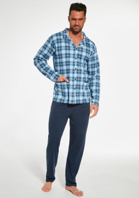 pánské rozepínací pyžamo od značky Cornette, které je vyrobené z velmi kvalitní bavlny. Vzorovaný vrchní díl pyžama má límeček, kapsy a zapíná se knoflíky. komplet doplňují dlouhé jednobarevné kalhoty bez úpletů. Pyžamo je baleno v dárkové krabičce.