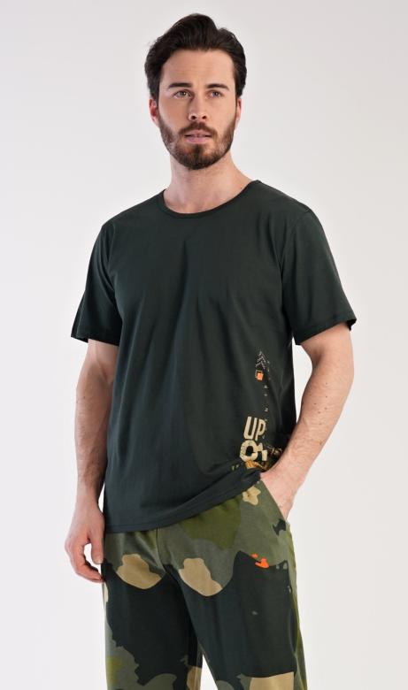 Pánské pyžamo se skládá z trika s krátkým rukávem a dlouhých kalhot.