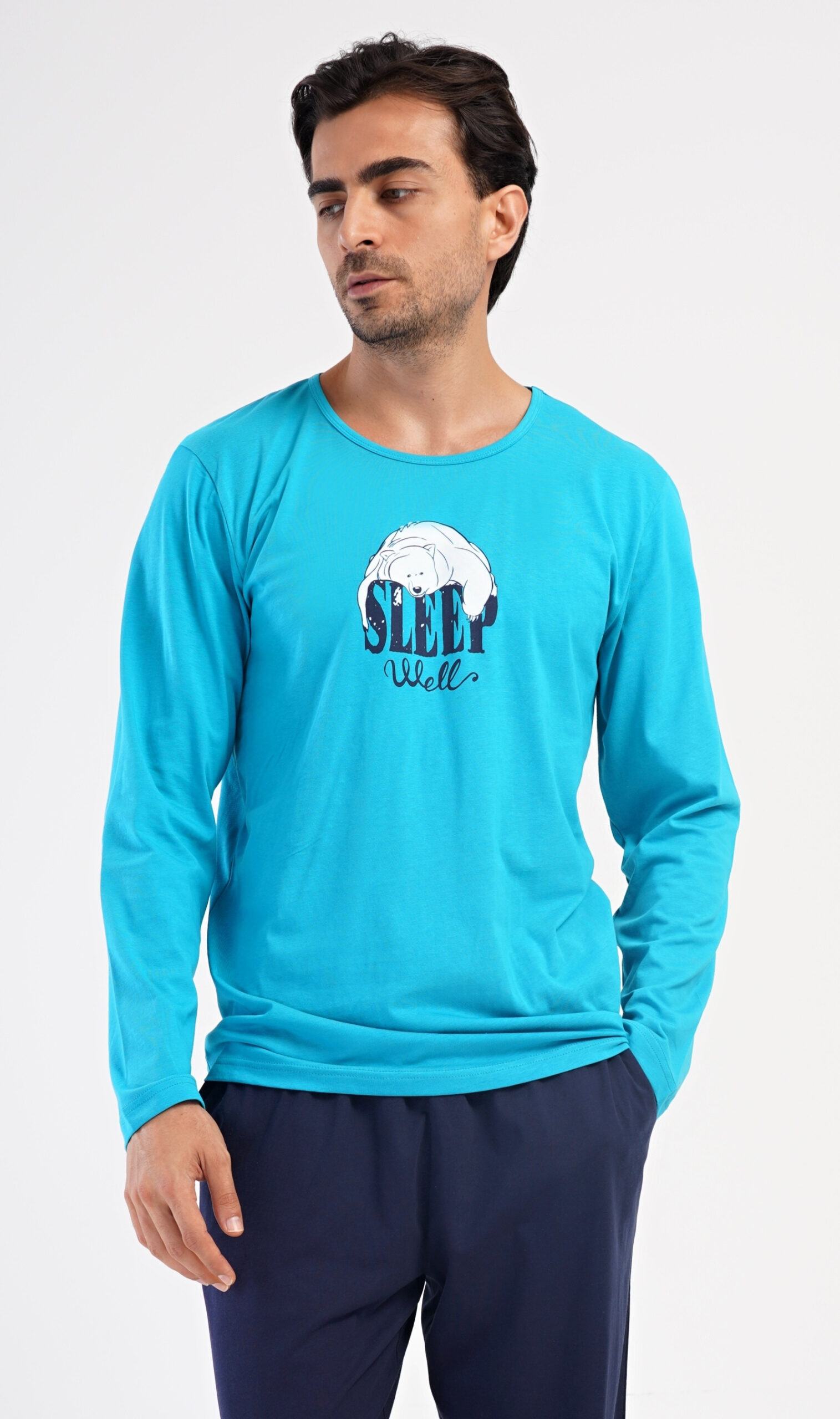 Pánské pyžamo se skládá z trika s dlouhým rukávem a dlouhých kalhot, které jsou zakončeny lemy. Triko s kulatým výstřihem zdobí na hrudi obrázek ledního medvěda a nápis SLEEP WELL.
