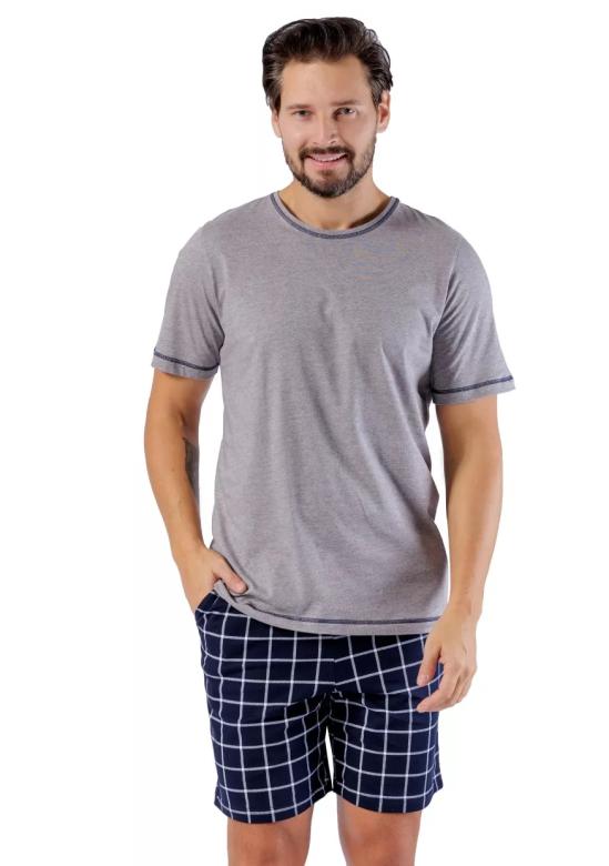 Pánské pyžamo Gregorz 1592/51 značky HOTBERG je ideální volbou pro muže, kteří hledají pohodlí a styl zároveň. Lehký šedý top s krátkým rukávem nabízí příjemný volný střih a elegantní kontrastní lemování, které podtrhuje moderní vzhled. Spodní část tvoří tmavě modré kraťasy s výrazným bílým kostkovaným vzorem, vybavené pružným pasem pro maximální komfort během nošení.
