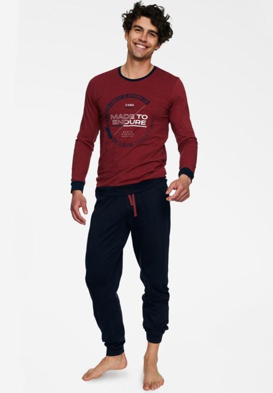 pánské pyžamo od značky Henderson je vyrobeno z příjemného a kvalitního materiálu. Tričko má dlouhý rukáv, kulatý výstřih a potisk na přední straně s logem. kalhoty mají dlouhé nohavice, všitou gumu v pase a šňůrku na zavazování. Všitá guma se nachází i na konci nohavic. Materiálové složení: 100% bavlna.