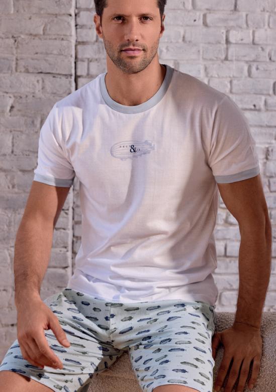 Pánské pyžamo značky Infiore se skládá z pohodlného trička s krátkým rukávem v bílé barvě s jemnými kontrastními lemy u krku a rukávů a decentním potiskem na hrudi, které doplňují světle modré kraťasy s drobným vzorem. Materiál je příjemně měkký, lehký a prodyšný, ideální pro pohodlný spánek i domácí relax. Kraťasy mají volnější střih a elastický pas, díky kterému se dobře přizpůsobí postavě a neomezují v pohybu. Stylový a praktický set, který nabízí maximální komfort při každodenním nošení.