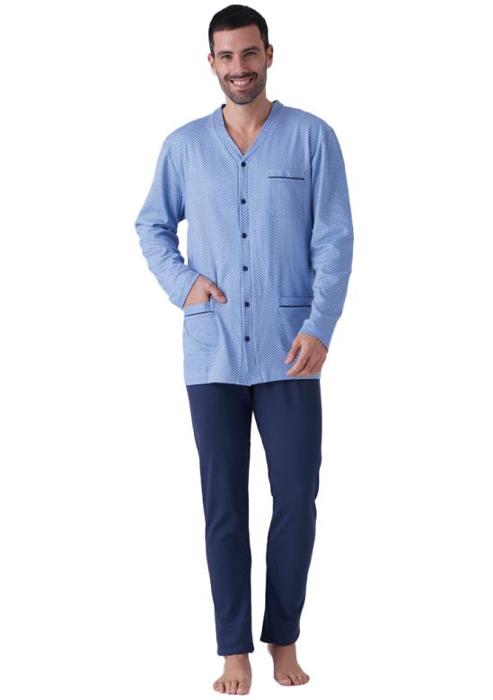 pánské pyžamo značky Karelpiu. Pyžamo se skládá z kabátku, který je celopropínací na knoflíky, výstřih je do „V“. Na levé straně je našitá kapsička a kapsičky jsou našité i ve spodní části. kalhoty jsou v pase do pružné obšité gumy. Pyžamo nemá žádné lemy a je pohodlné na nošení, je ušité z příjemné bavlny.