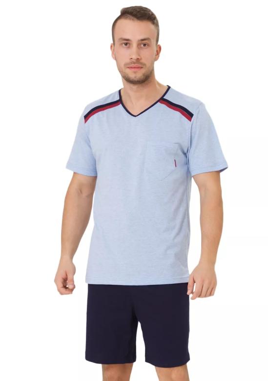 Set se skládá z vrchní části v jemné světle modré barvě s véčkovým výstřihem a praktickou náprsní kapsou s červeným detailním proužkem.