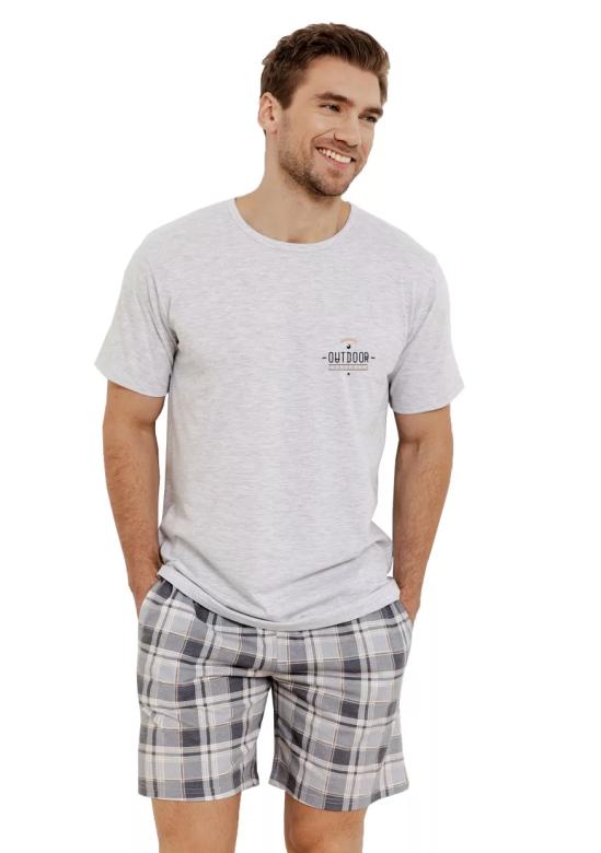 pánské pyžamo Ralph 3392 značky TARO nabízí ideální kombinaci pohodlí a stylu pro moderního muže. Lehký šedý top s krátkým rukávem je elegantně doplněn nenápadným motivem „OUTDOOR“ na hrudi, který podtrhuje jeho originální vzhled. Kraťasy v klasickém kostkovaném vzoru dodávají celé soupravě příjemně uvolněný charakter. Díky měkkému a prodyšnému materiálu je tento set vhodný nejen na spaní, ale i na relaxaci během dne, kdy oceníte volnost pohybu a příjemný pocit na kůži.