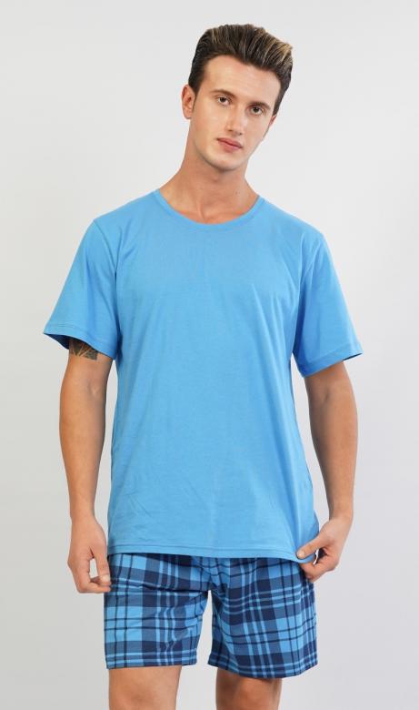 Pánská souprava má triko jednobarevné s krátkým rukávem a šortkové kalhoty v kostkovaném vzoru.
