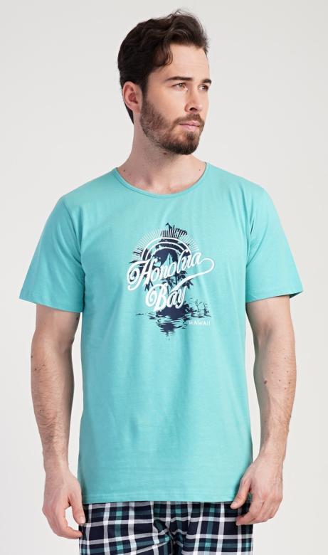 Pánské pyžamo má triko s krátkým rukávem a hawajským motivem, jednobarevné pohodlné šortky bez kapes.