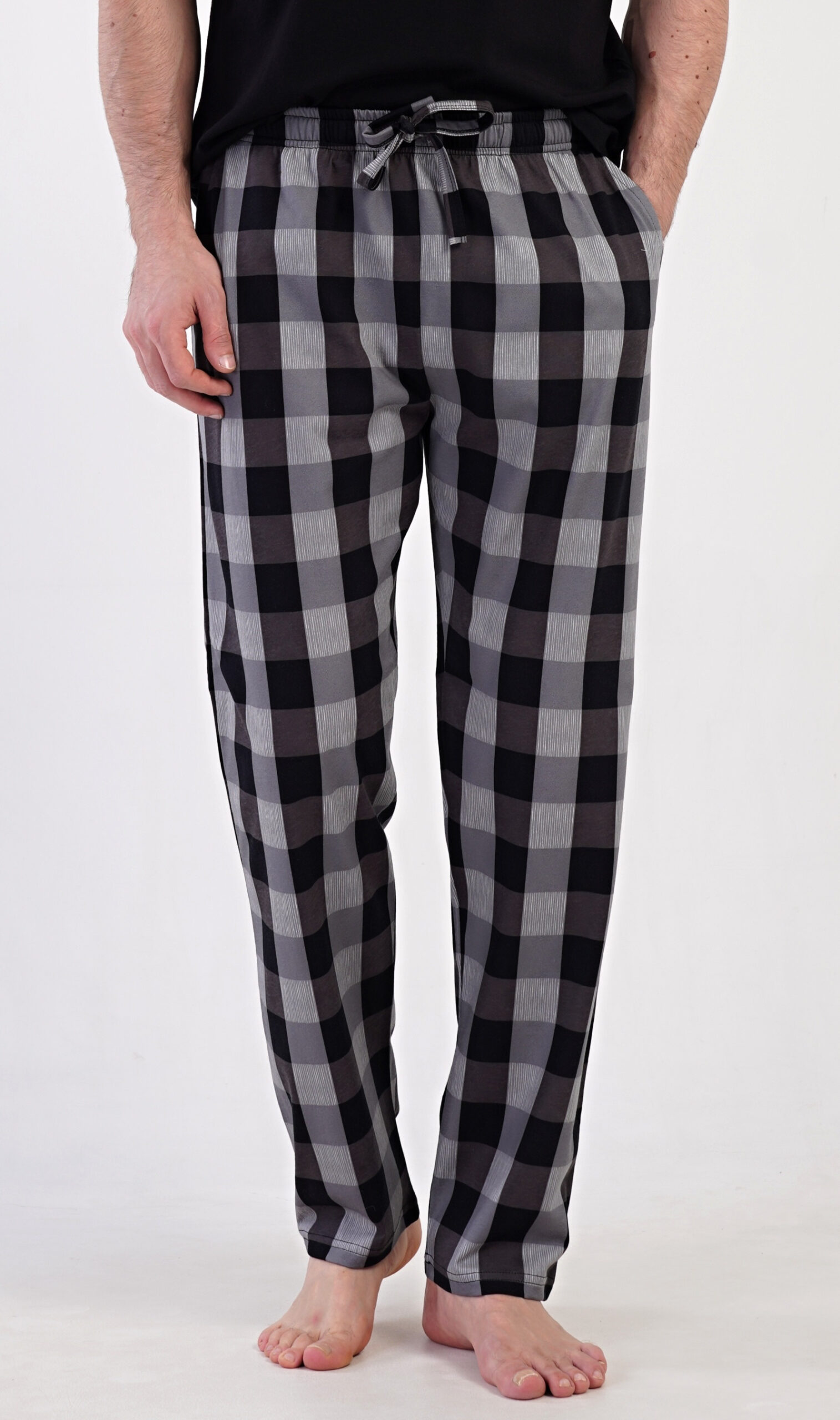 Kalhoty v kostkovaném vzoru mají v pase gumu a šňůrku na stažení, po bocích jsou všité kapsy.