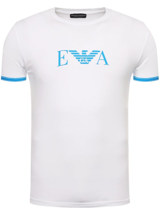 Kvalitní bavlněné pánské triko Emporio Armani v bílé barvě s modrým logem značky a modrým lemováním.