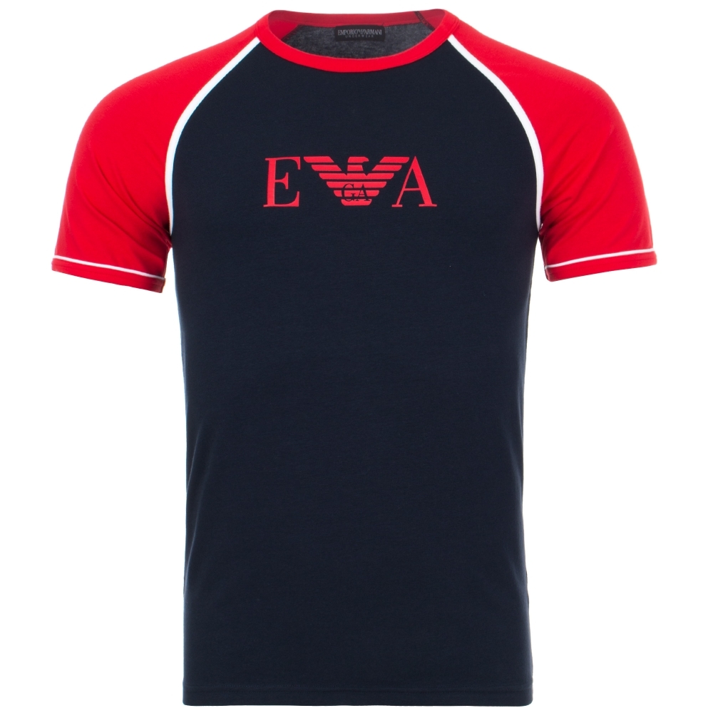 Triko je v kombinaci barvy tmavě modré s červenými nápisy a bílými detaily.