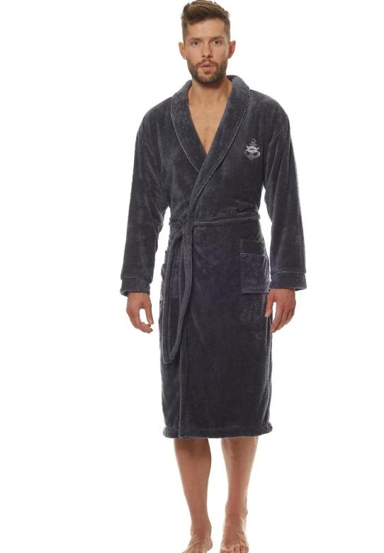Krásný hřejivý župan s límcem a vázáním v pase. Na hrudníku má výšivku, která dodává luxusnímu vzhledu. Ideální doplněk pro chladné zimní večery.