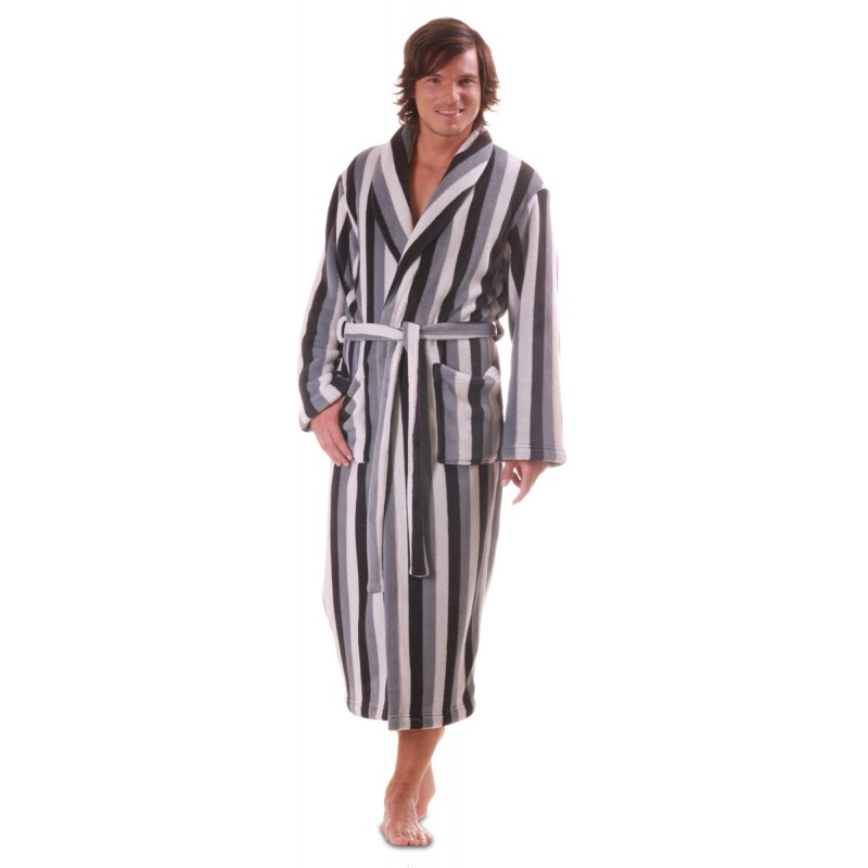 Hřejivý pánský župan Vestis v jemných šedých tónech v pruhovaném designu, který nadchne příjemným omakem, lehkým teplým materiálem a pohodlným střihem.