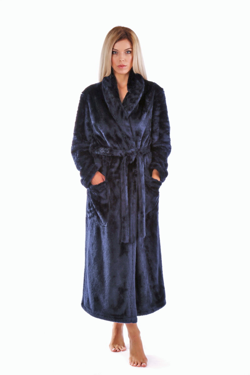 Pohodlný župan se šálovým límcem má dvě kapsy a uprostřed pásek na zavazování.